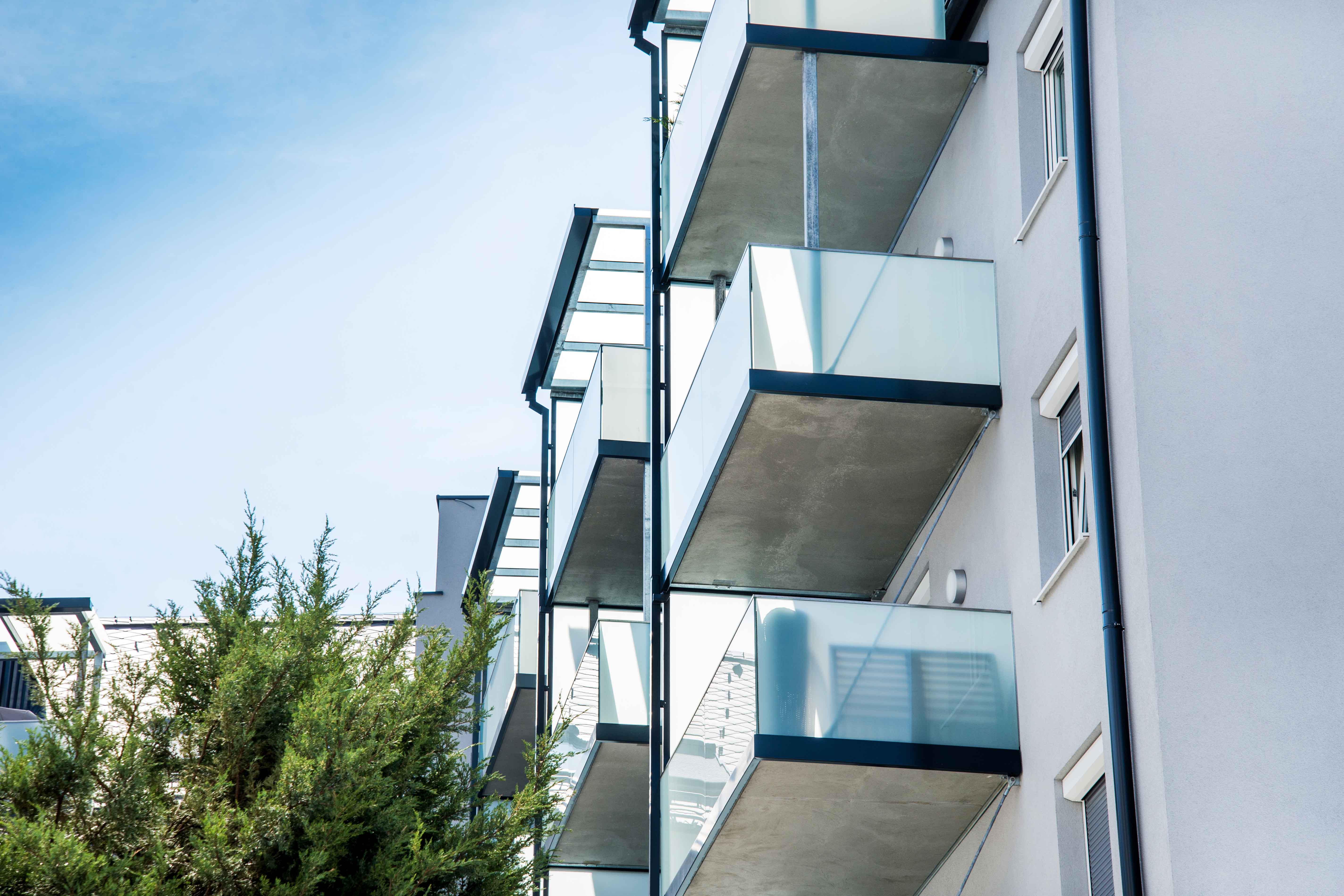 Thanks to the use of prefabricated components, 21 balconies were installed within a short time frame. Sleek glass railings and elegant glass canopies enhance both the visual appearance and functionality. The residents enjoy not only an aesthetic improvement but also increased living comfort through the added space and usability of their new balconies.